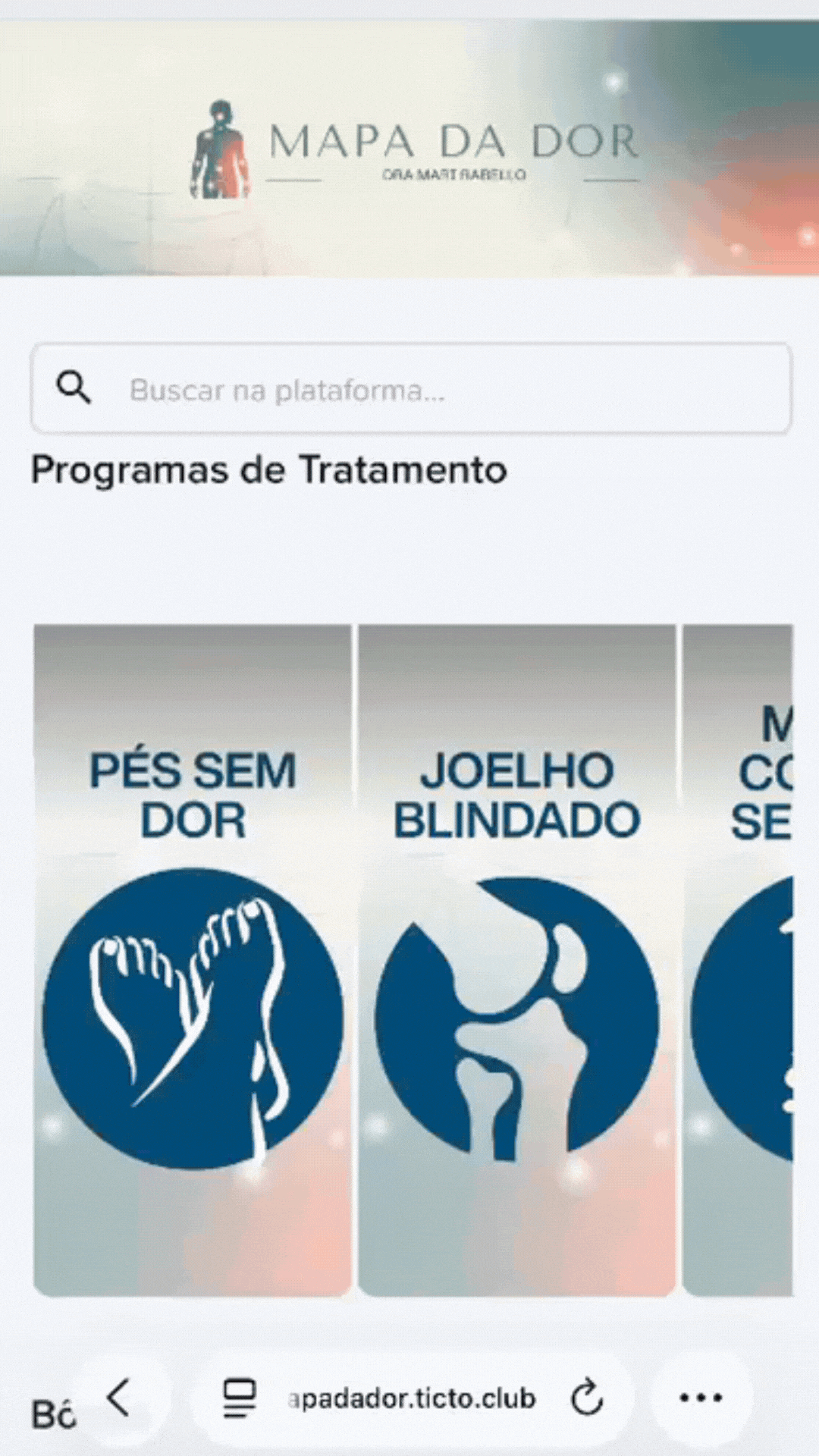 O mapa da dor tem todos os programas de tratamento em vídeo aulas para você assistir e fazer as técnicas, alongamentos e exercícios inteligentes em casa.